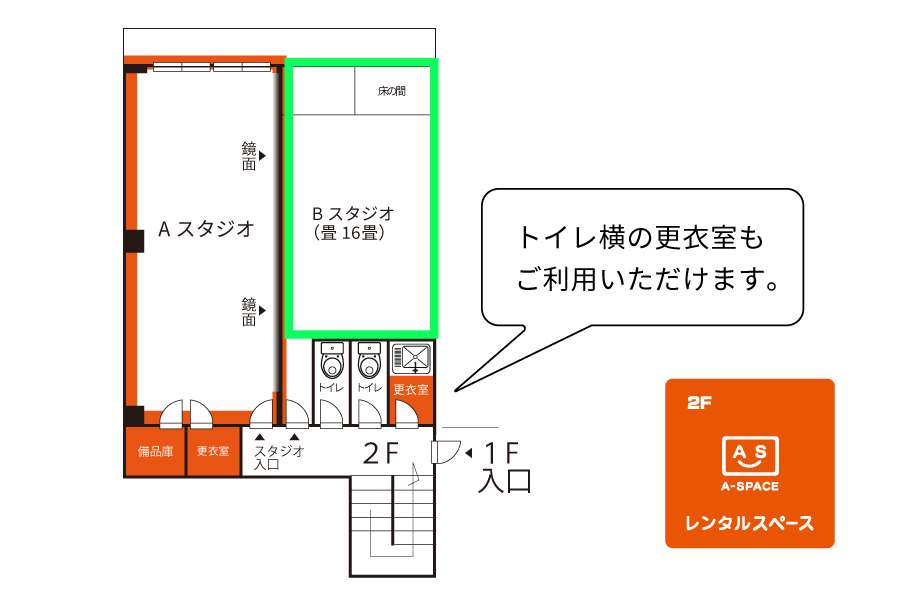 更衣室は2階トイレ横にございます。ご利用の際は、どうぞご自由にお使いください。